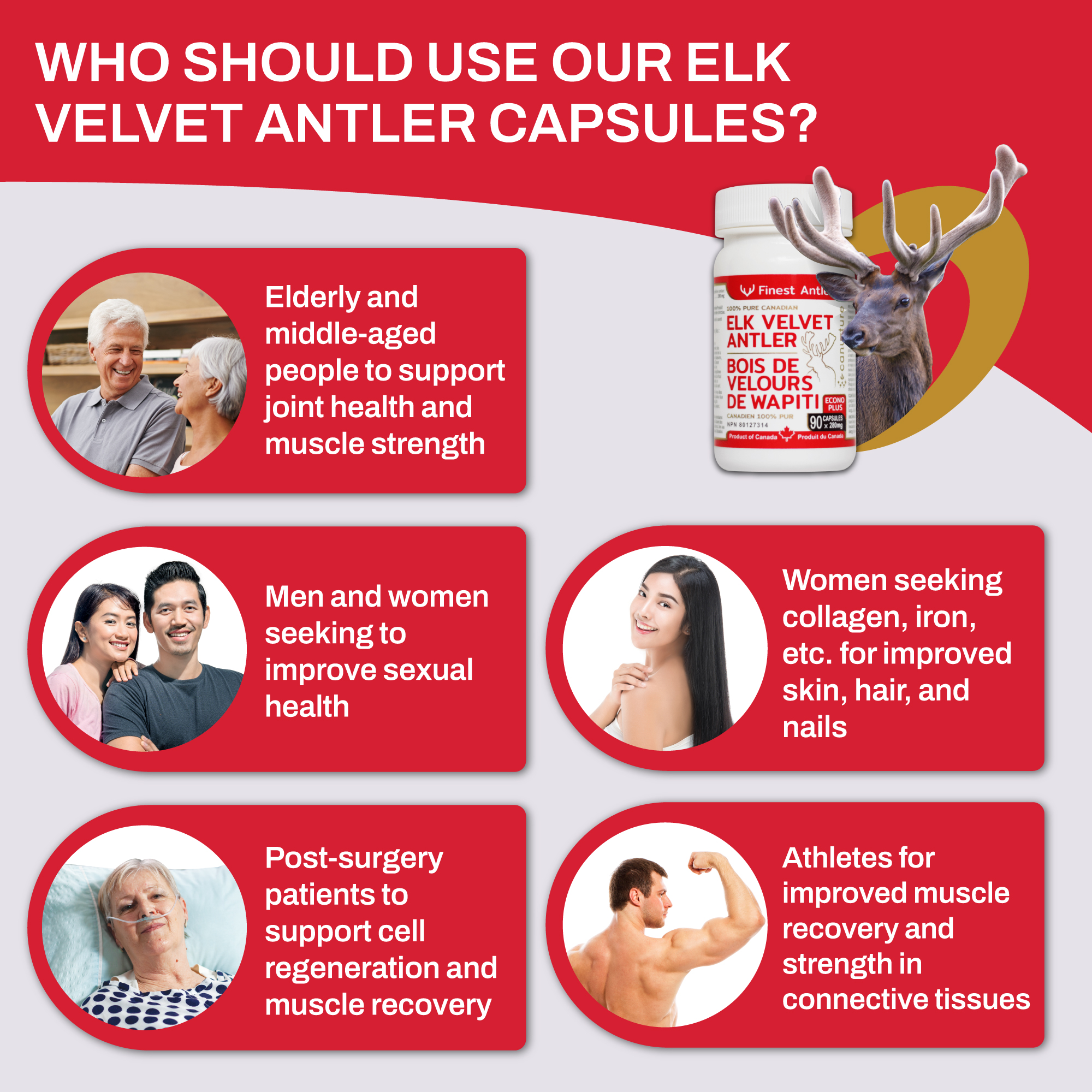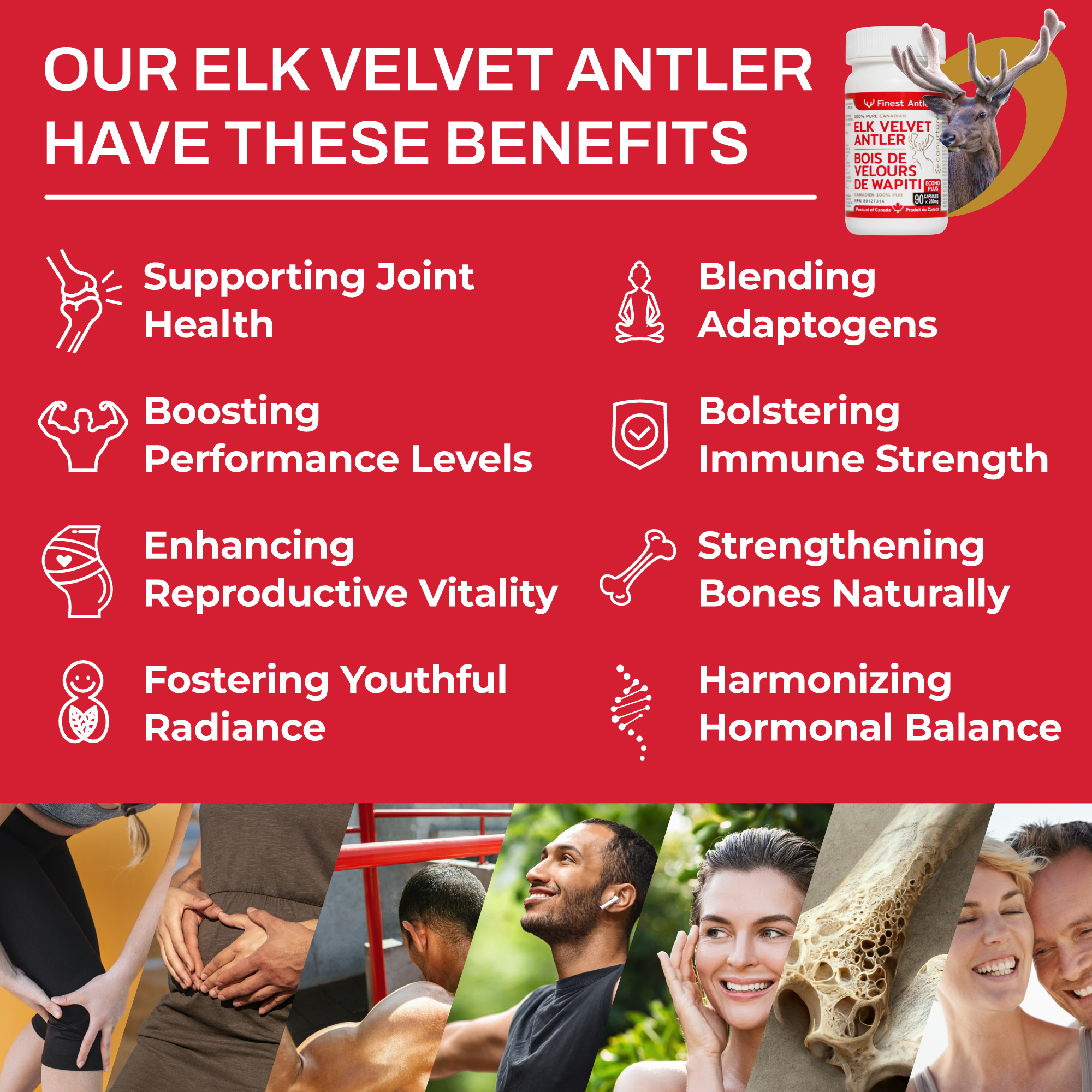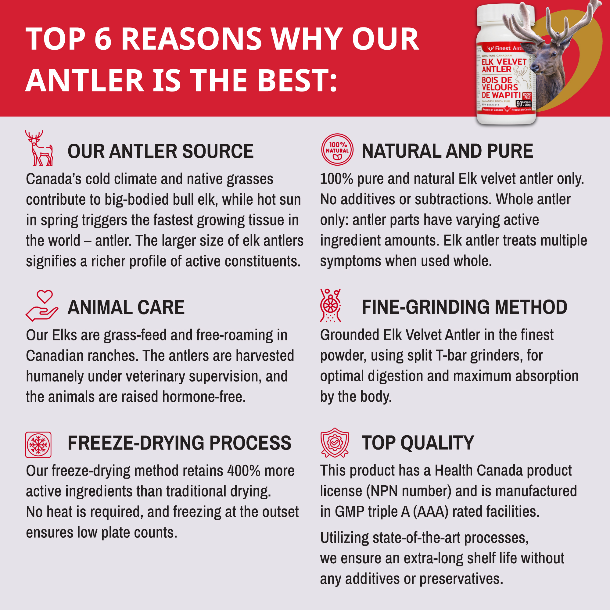 Our capsules are made from pure Canadian elk velvet antler with no added fillers, colors, flavors, or extras. We gather these antlers at their prime bioactive state, employing freeze-drying methods to uphold their utmost potency.
