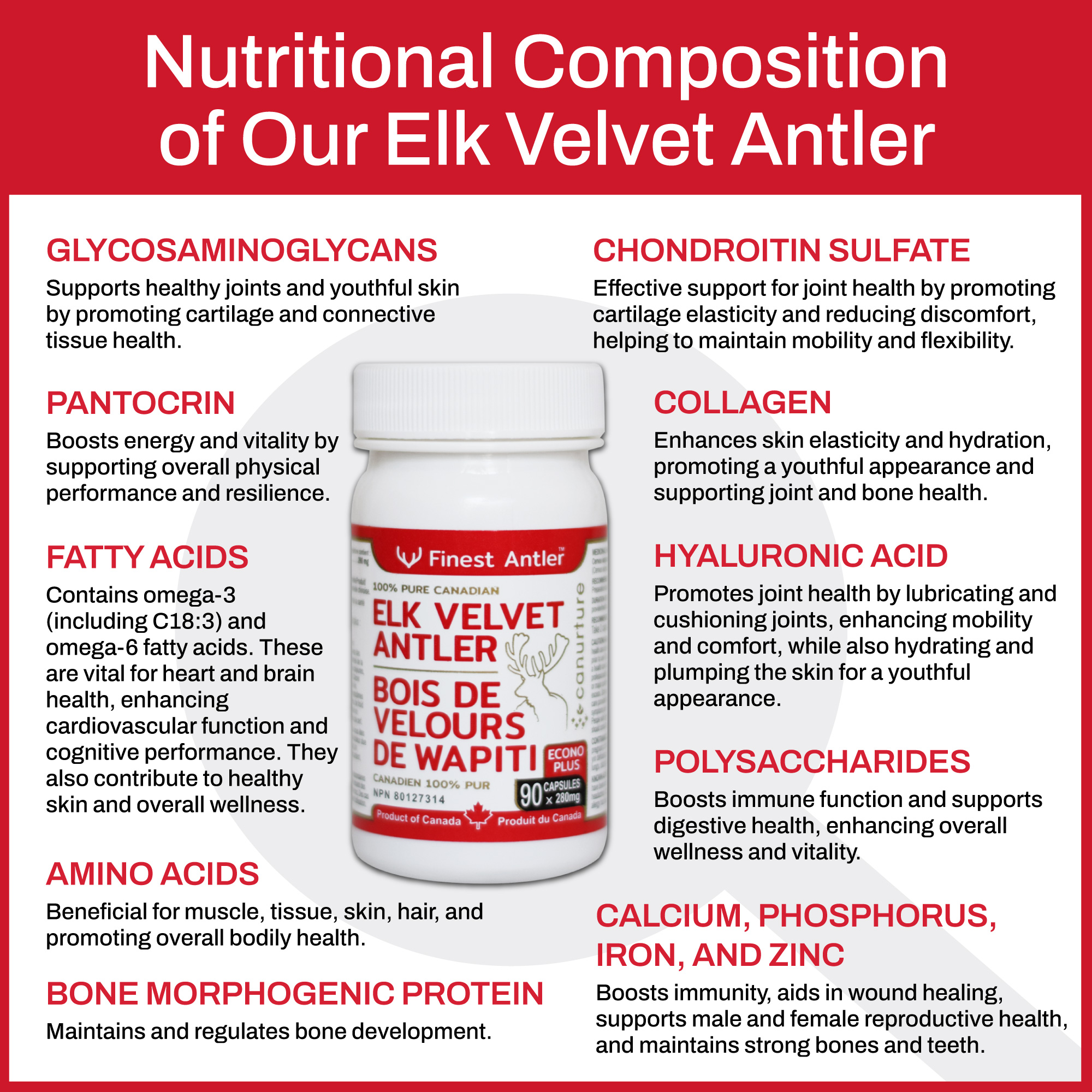 Elk Velvet Antler contains three (3) main ingredients: PANTOCRINE, CHONDROLIN SULFATE AND 8 ESSENTIAL AMINO ACIDS.