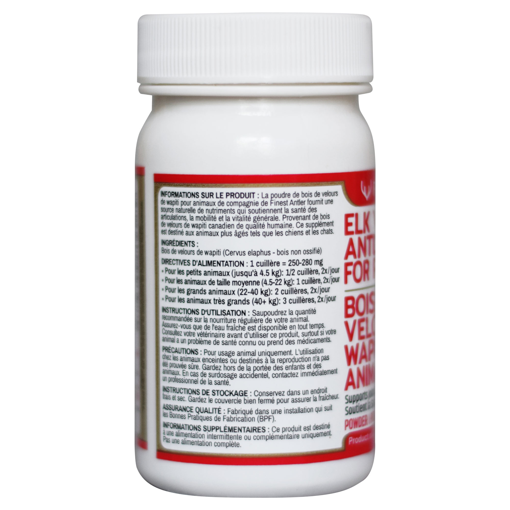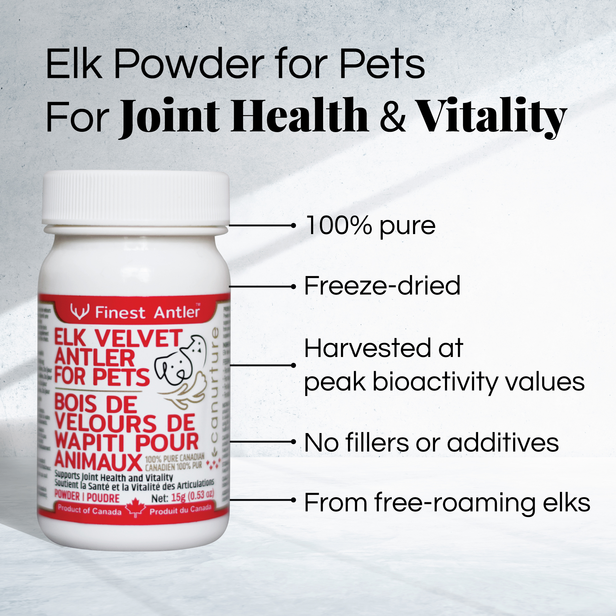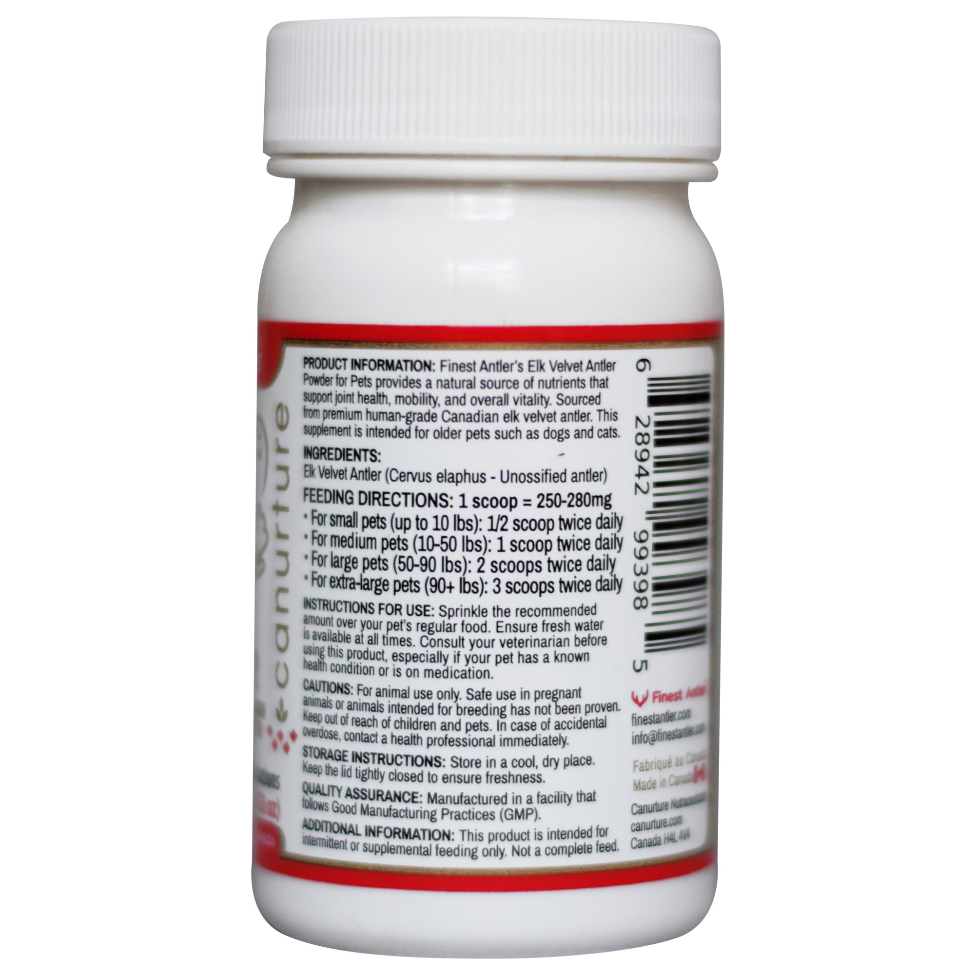 PRODUCT INFORMATION: Finest Antler’s Elk Velvet Antler Powder for Pets provides a natural source of nutrients that support joint health, mobility, and overall vitality. Sourced from premium human-grade Canadian elk velvet antler. This supplement is intended for older pets such as dogs and cats.
