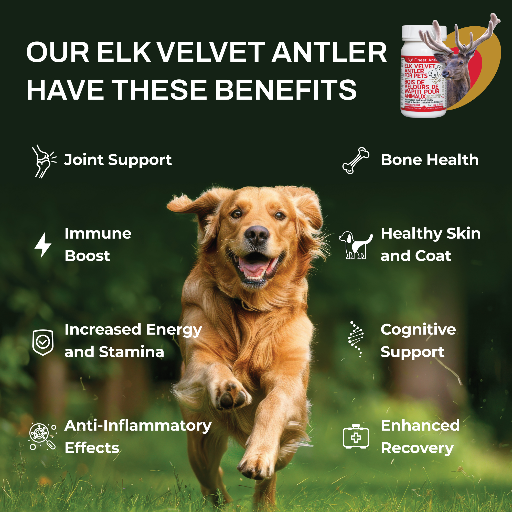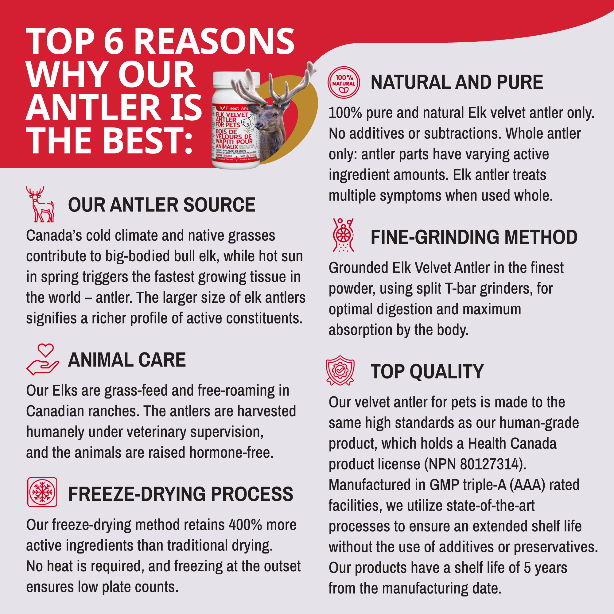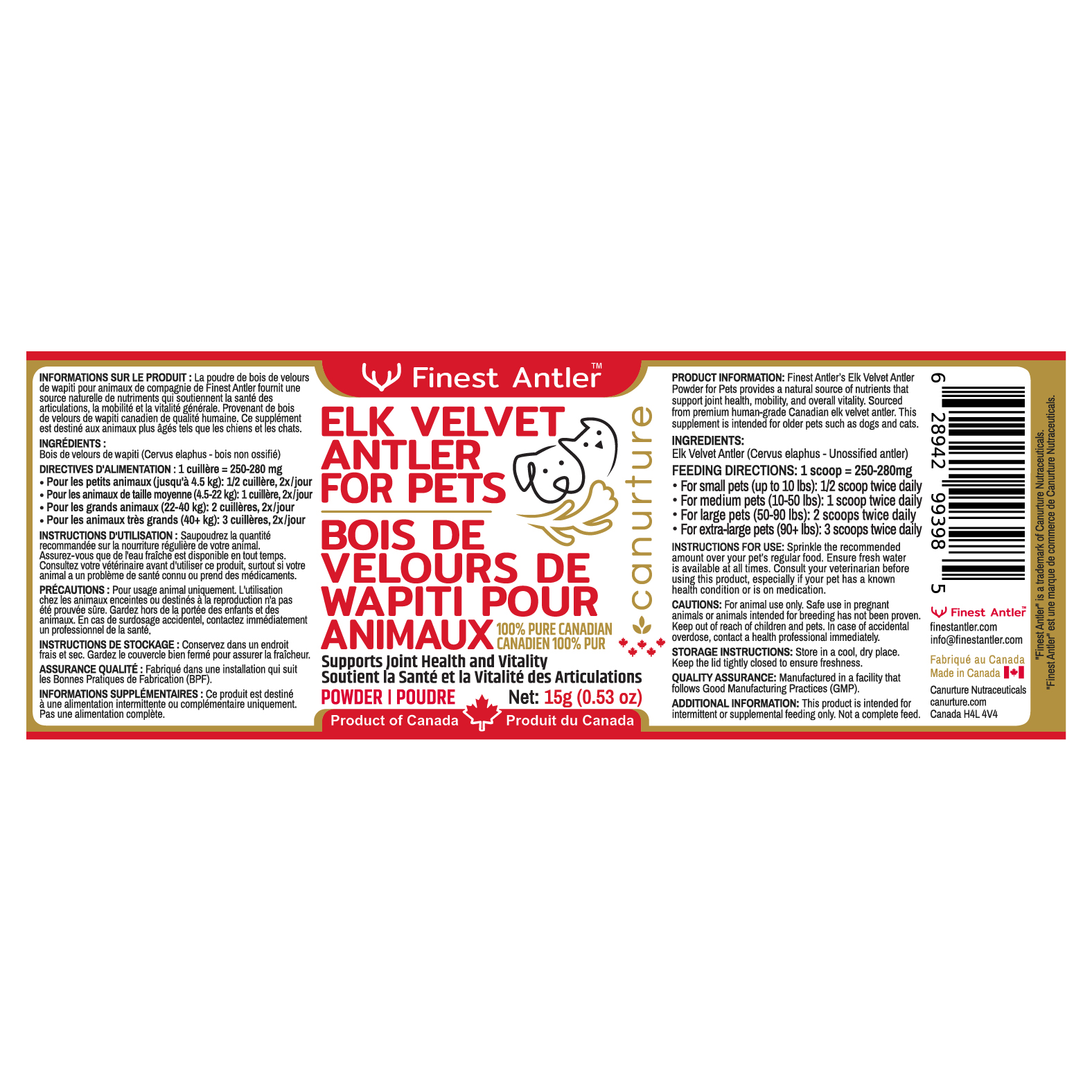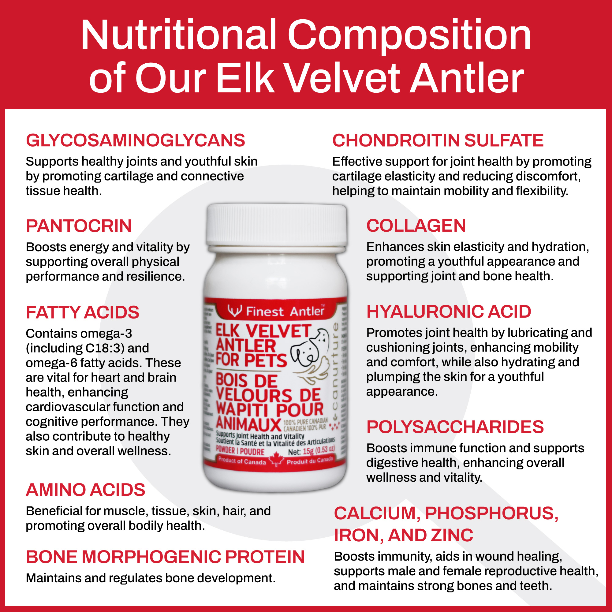 PRODUCT INFORMATION: Finest Antler’s Elk Velvet Antler Powder for Pets provides a natural source of nutrients that support joint health, mobility, and overall vitality. Sourced from premium human-grade Canadian elk velvet antler. This supplement is intended for older pets such as dogs and cats.